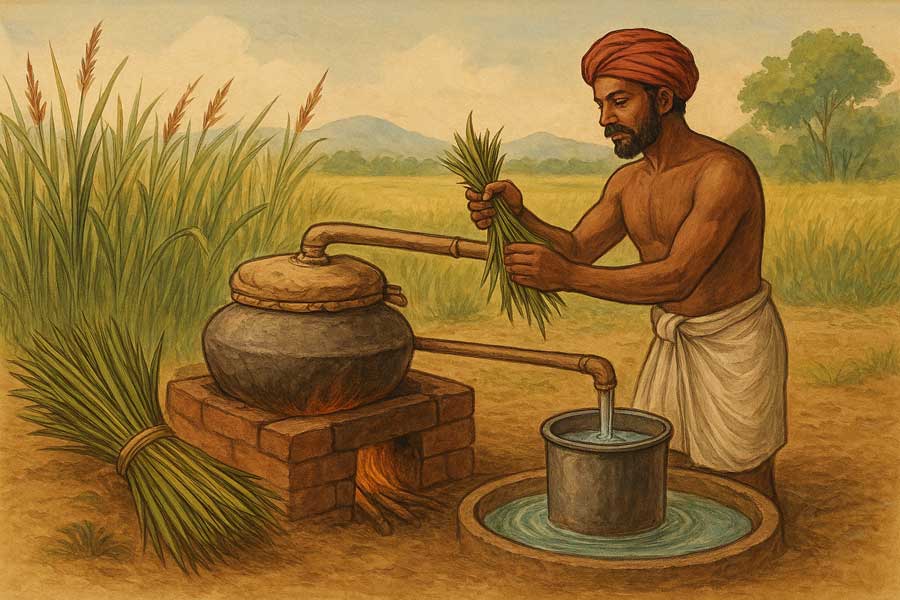 Distillation of Rusha Grass oil, Central Provinces The grass, Andropogon schoenanthus or Rusha grass, commonly known as “Tikhari,” is a native of Central Provinces. It grows wild in swamps with erect culms, and attains a height of 3 to 6 feet. The leaves are long, smooth, tapering and have a strong aromatic smell and pungent test. The root locally known as “Mirchia kand” is perennial, with long wiry fibers. The oil obtained from this plant has become an important article of commerce. It is now chiefly distilled in many parts of Central provinces, especially in Betul, Nimar and Hoshangabad districts, by private persons, and taken to Ellichpur town, which is the chief market of export. Its current price is from Rs. 2 to Rs. 4 a pound, according to its purity. The grass is very abundant, and the distilling of the oil requires only a moderate skill and very small initial capital. About 50,000 (fifty thousand) pounds are exported annually from Bombay to Arabia, and European Turkey, Jedda and ports along the Red Sea. Its European name is Palma Rosa oil or Geranium oil. The oil is chiefly used as an adulterant for attaroi roses. In some places the roses are sprinkled it and the attar \s distilled. It is a proved fact, that” Rusha” grass oil does not solidify by cold, and this is the chief adulterant which stops the crystallizing habit of rose oil when exposed to low temperature and prevents its congealing. Rusha grass oil should be first refined before it is ready for admixture with attar of roses. It is also necessary that it should lose its penetrating aromatic-smell and acquire the colour of the attar of roses. In order to effect this change it is shaken with water, then acidulated with the juice of lemon, and finally exposed to the sun and air. The oil thus refined has a very slight difference from affarof roses, and can serve as an admixture which is very difficult to detect. It is very difficult in these days to procure pure Rusha grass oil, as the oil of commerce is more or less adulterated by the local distillers themselves. The chief substances to adulterate this oil are turpentine and the oil of ground nut, linseed, rape, &c., &c. By such adulteration the oil temporarily becomes turbid, but after a time it settles again and becomes clear. Pure oil should be of a pale sherry colour. The oil, which is considered to be cooling and astringent, is used as a liniment in rheumatism, headache and skin-diseases, and has the property of curing baldness. It is a powerful stimulant when applied externally, but is never taken internally, except in very minute doses for bilious affections. The grass, as far as I know, is not used as a fodder for cattle.